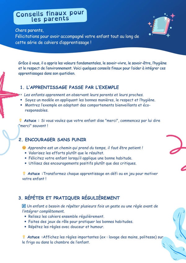 Apprenez à votre enfant les valeurs essentielles qui feront de lui une personne bienveillante et respectueuse. Ce cahier ludique et interactif l’accompagne dans l’apprentissage de la gentillesse, du respect, du partage et de la patience à travers des histoires illustrées, des jeux et des activités créatives.